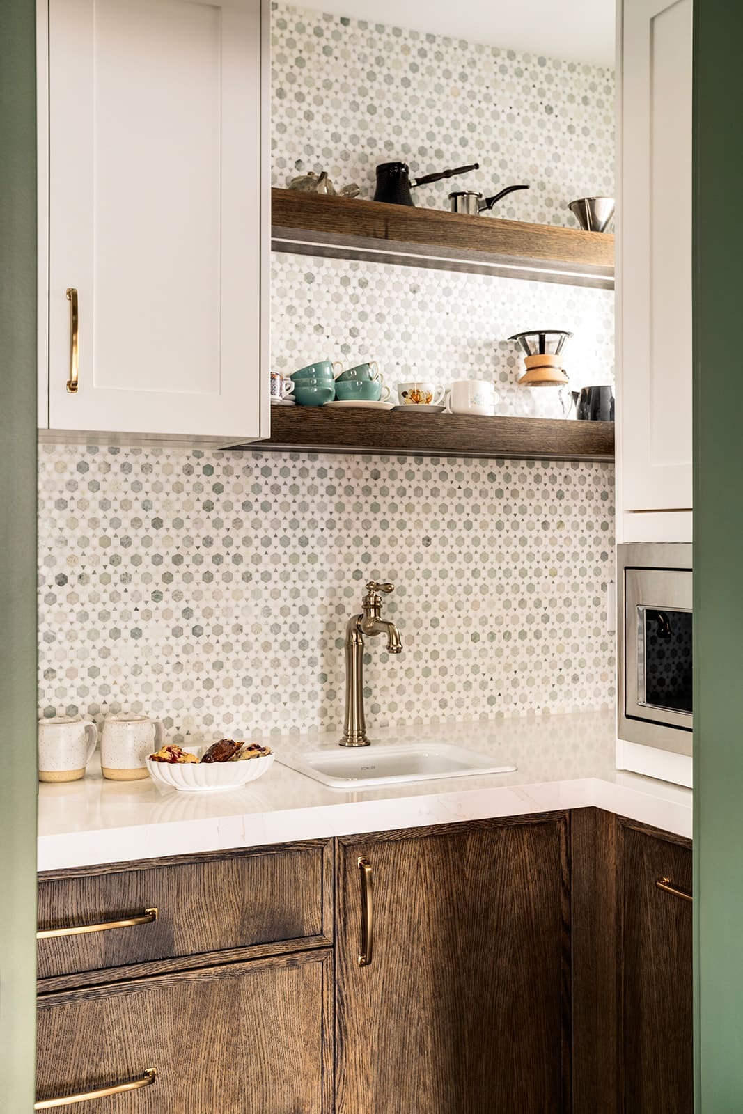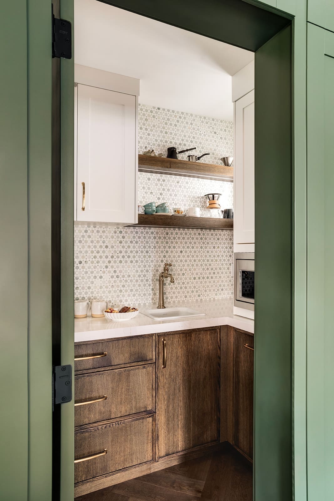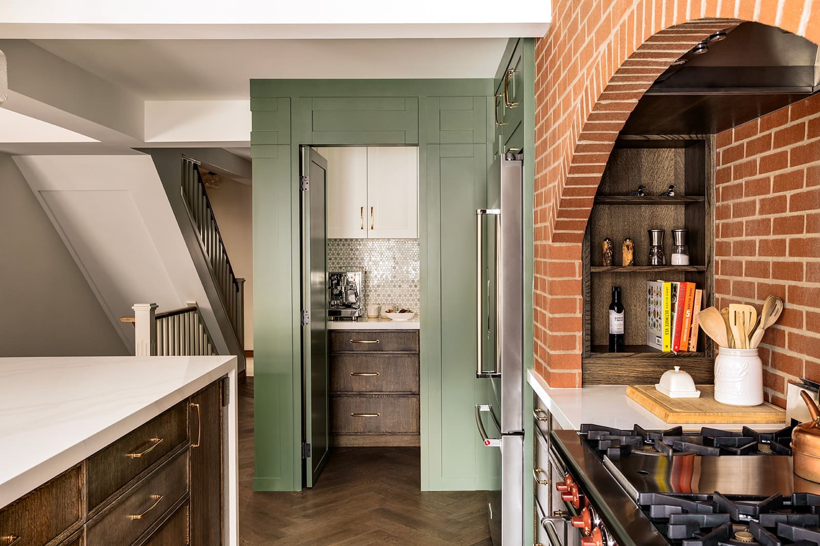 Structural upgrades, including the installation of a steel beam, made it possible to remove key barriers while maintaining stability. The redesign also incorporates concealed storage, a butler’s pantry, and tailored millwork solutions that work around the home’s original windows, resulting in a space that feels both highly functional and architecturally integrated.